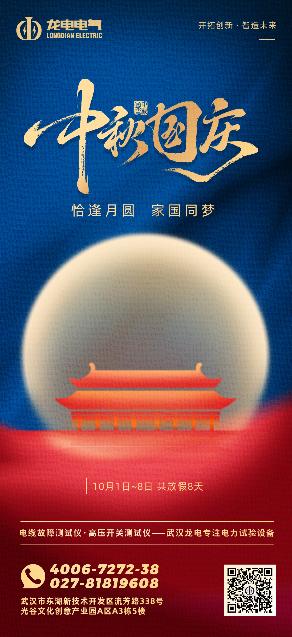 秋色宜人,月圓情濃。值此中華人民共和國成立76周年華誕暨傳統中秋佳節(jié)來臨之際,武漢市龍電電氣設備有限公司全體員工向您致以最誠摯的節(jié)日問候與祝福!